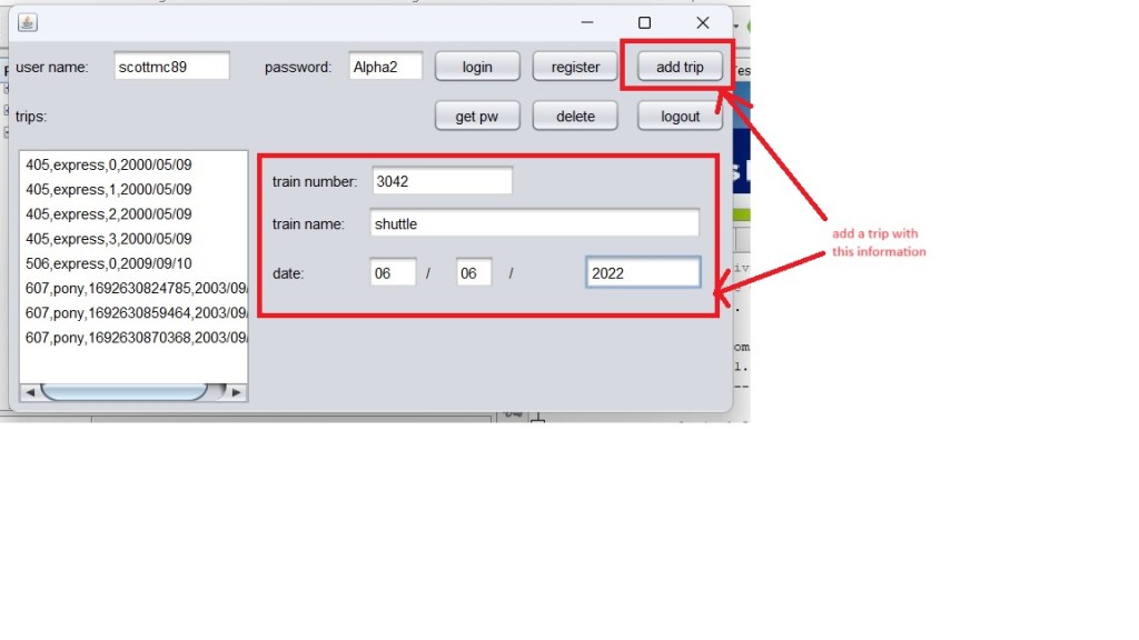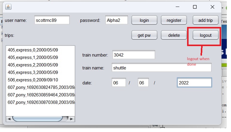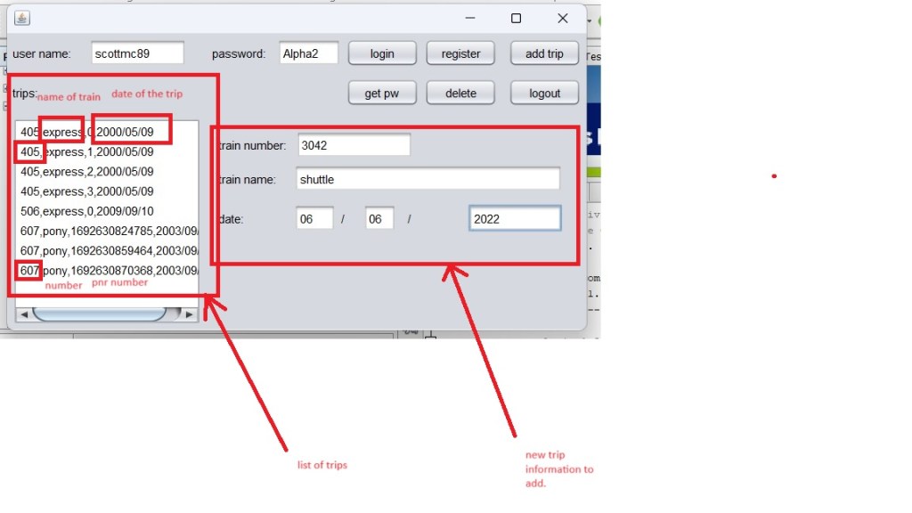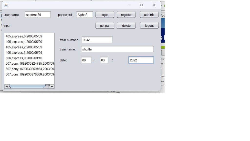 Above those two are collection classes allowing for CRUD operations on lists of the traininfo and user classes, they are traininfolist and userlist. The main class, trainappmaven, has all the functions that allow for login, logout, delete a trip, and all of that. On top of the main class, we have the frame class with the action handlers for your buttons and text fields. Inside the trainappmaven, we have a small database connection that allows for communication with access. It allows for a big read of the db to populate the user list and train list. Here is the code on my Github: https://github.com/smc897/OIBSIP