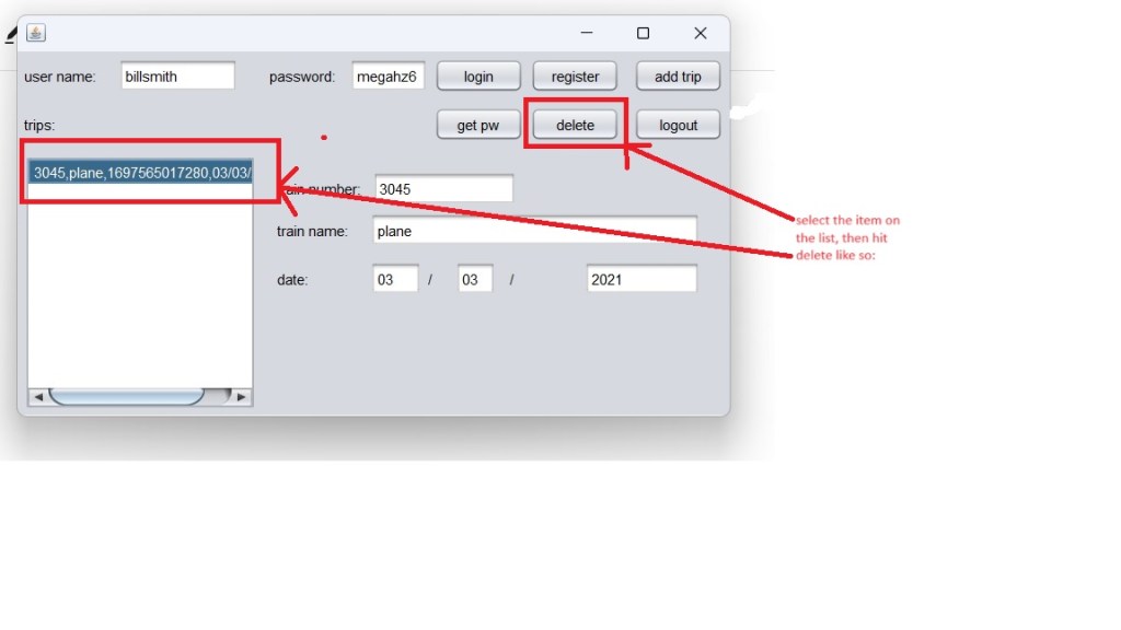 3. Delete a trip: First, select a trip on the left hand list, then hit “delete” like so: