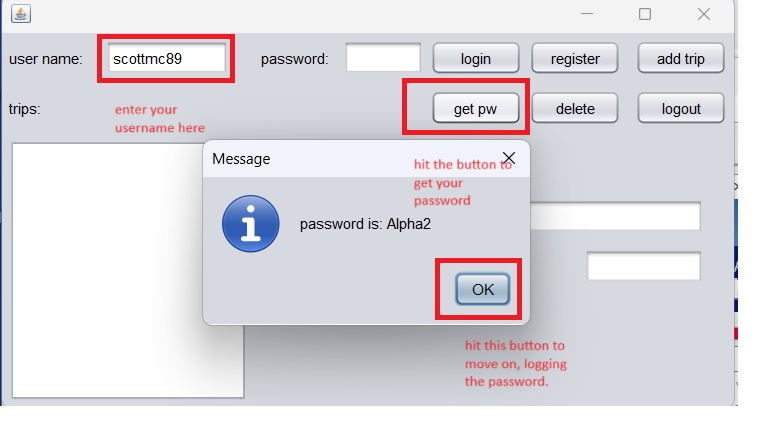 5. Get password, in case you forget: Here is how you can retrieve a password, if you remember your username, type in your username in the user name field, then hit “get pw”, like so:
