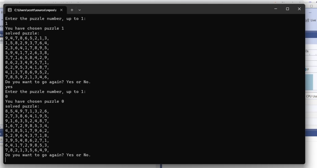 Here is how to use it: enter the puzzle number, up to and including the max number that it gives you. It spits out the solved puzzle. It asks you if you want to go again, enter yes or no. Capitalization doesn’t matter. Run as many times as you want, enter no to quit.
