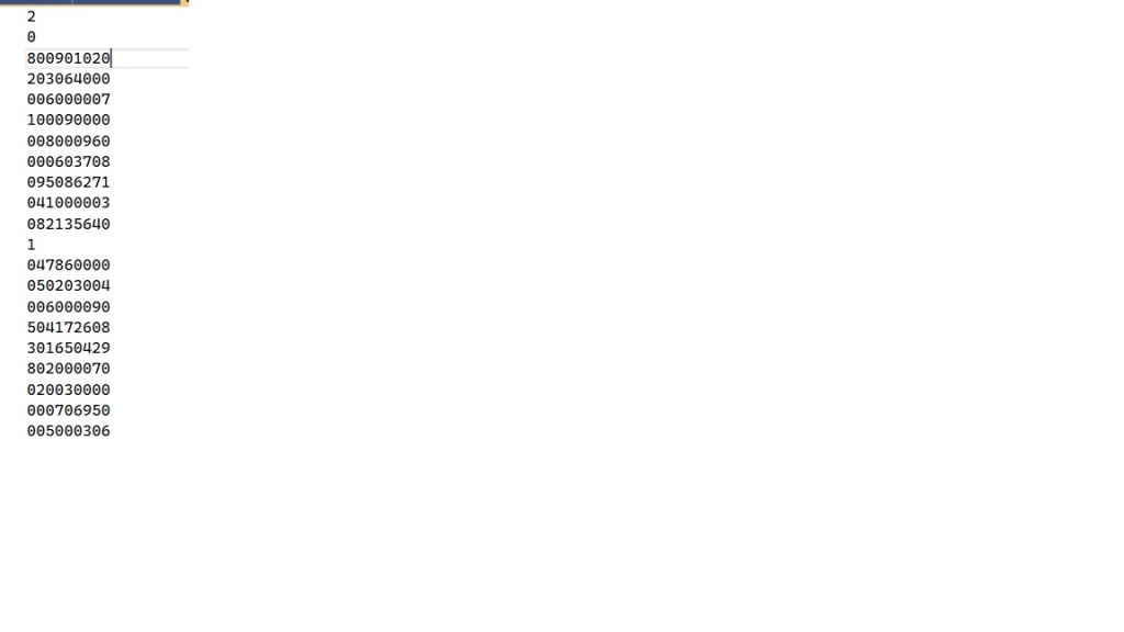 The 2 at the very top corresponds to the number of puzzles in the file. The next line down, 0, refers to puzzle 0. The next nine lines are the contents of puzzle 0. After that, we have 1, which stands for puzzle 1. Then, we have the nine lines for puzzle 1. To add a puzzle, add the puzzle number, which is 1 above the closest one above. Also, increment the very top number of the file. Then, after the puzzle number, add the nine lines of content. Save. The program is ready to run.