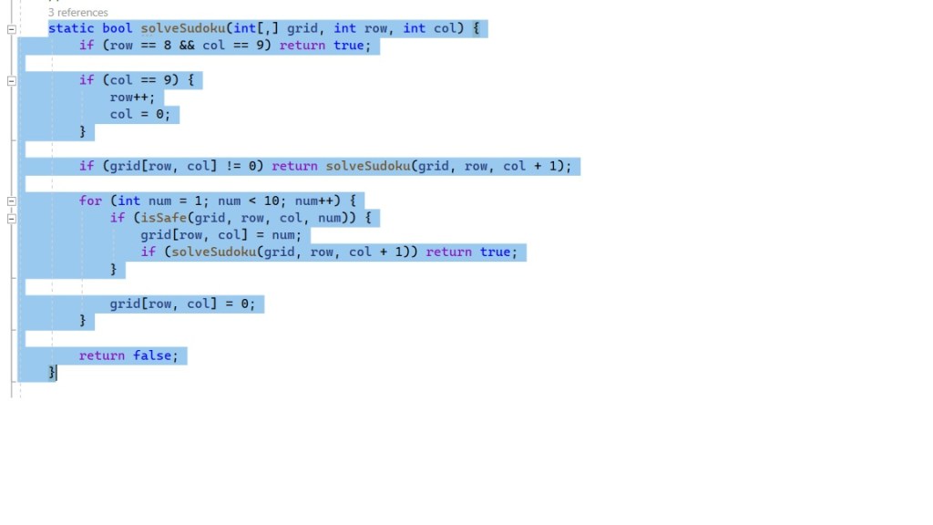 As you can see, it basically runs thru 1..9 for each cell, when it finds one that is safe, it places it into the cell, then moves onto the next cell. When it advances past the end of the puzzle, it returns back to the main loop. Cool. There is some junk dealing with converting between lists and arrays, for a better look here is the code on my Github: https://github.com/smc897/sudoku
